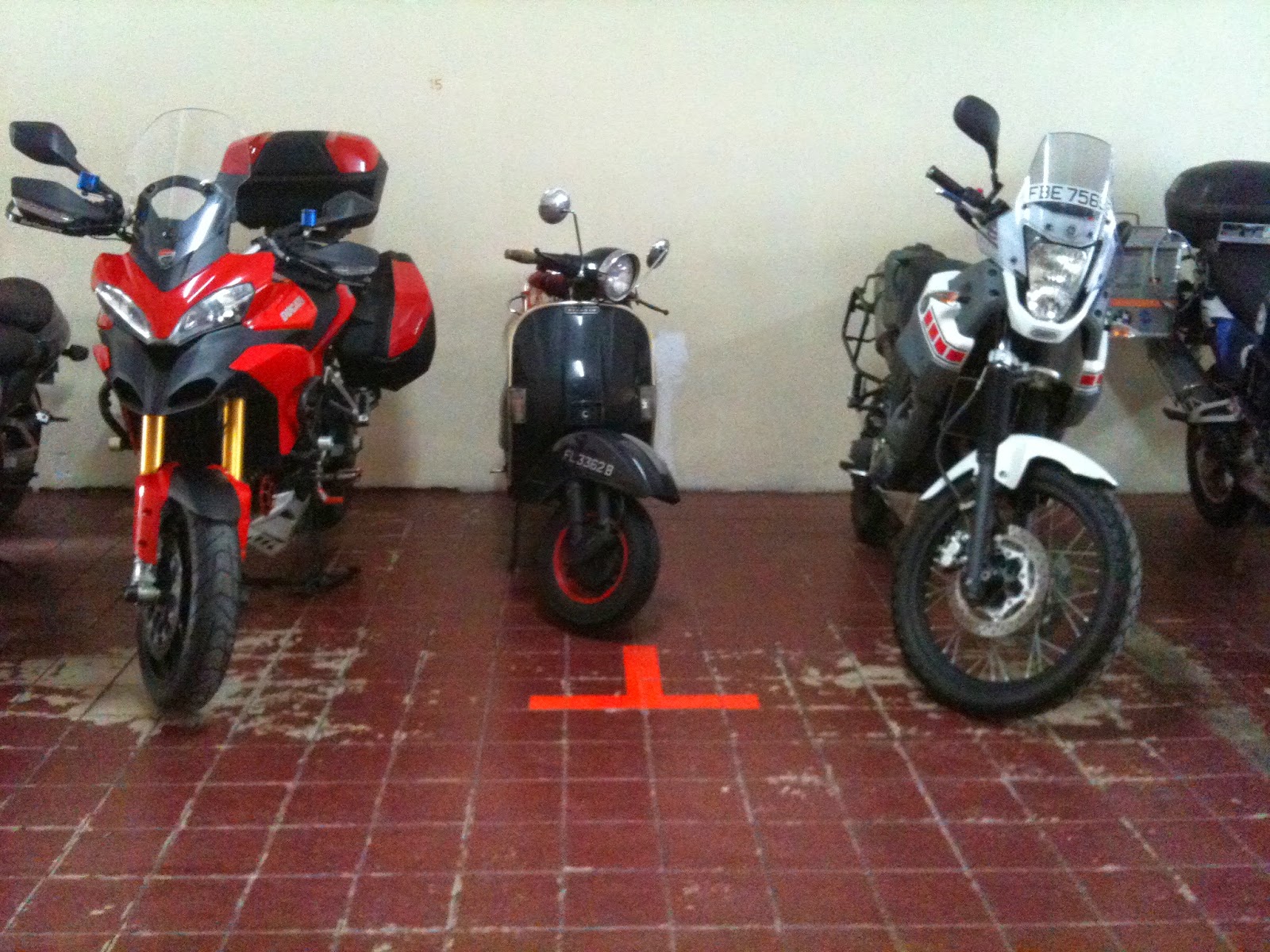 Ebony Rouge flanked by the handsome tourers. From left to right, Ducati Multistrada, Ebony Rouge the Vespa, Yamaha XT660 Tenere. She looks so diminutive here.