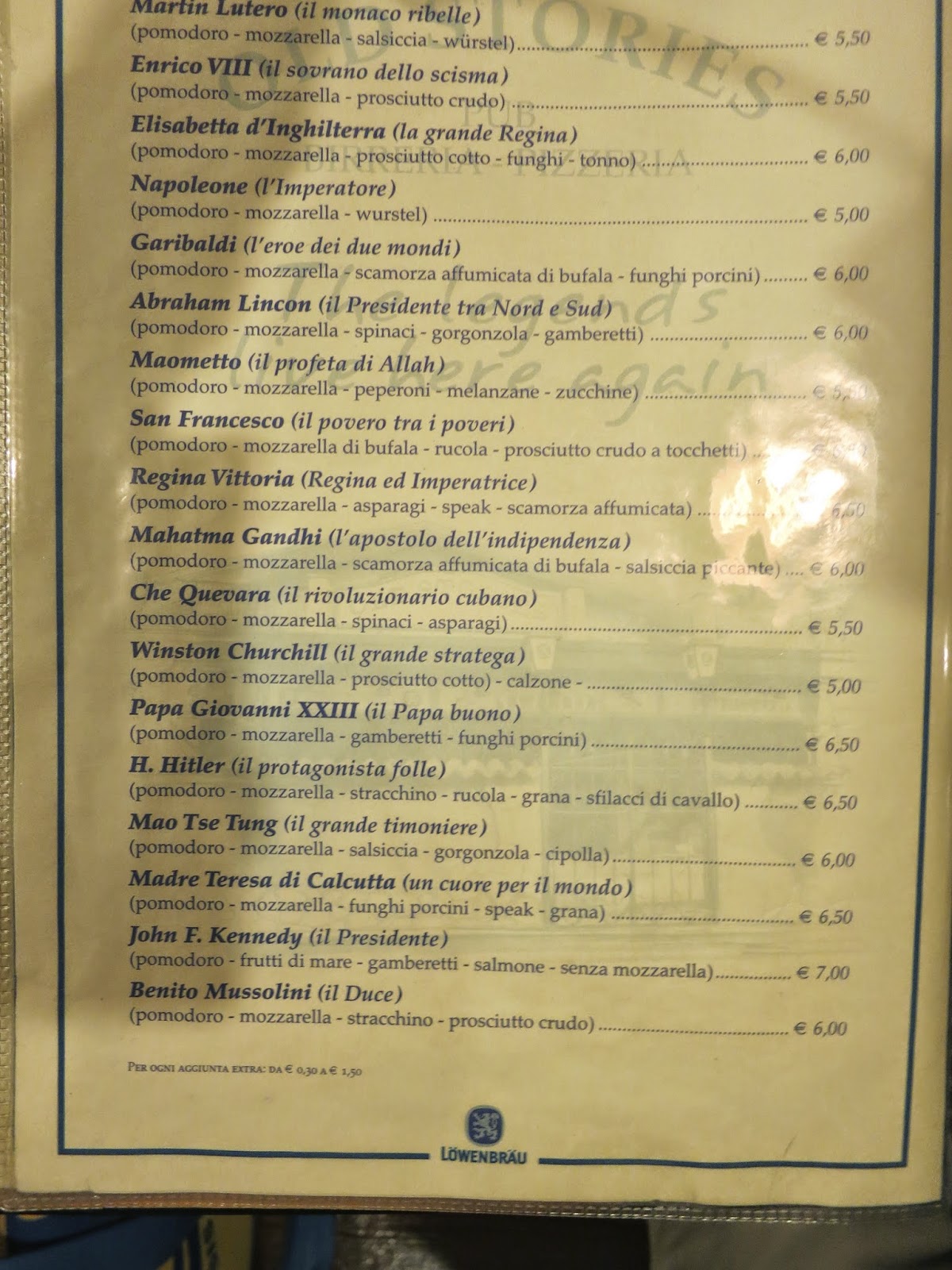 | The pizzas are named after famous people, the Chinese ladies found the Mao Tse Tung pizza amusing. |