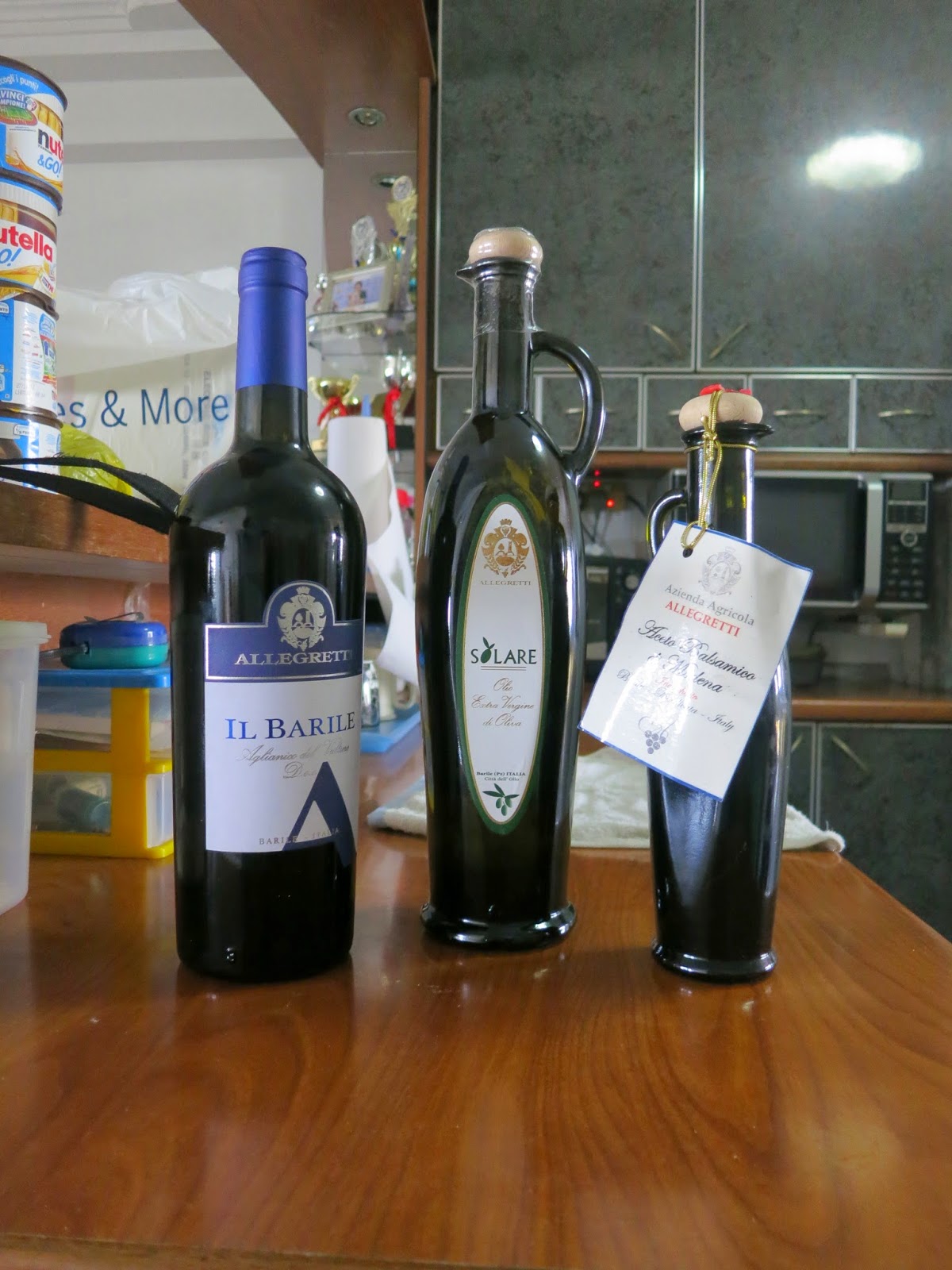 | His wine, Il Barile, Aglianico del Vulture, the Olive Oil, and the Balsamic Vinegar. |